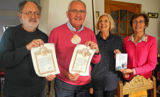 Ronan, Evelyne et Marie entourent leur frère Yves Boccou arborant la fameuse coquille symbole du pèlerin ainsi que la Compostela, attestation délivrée à l'issue du chemin.
